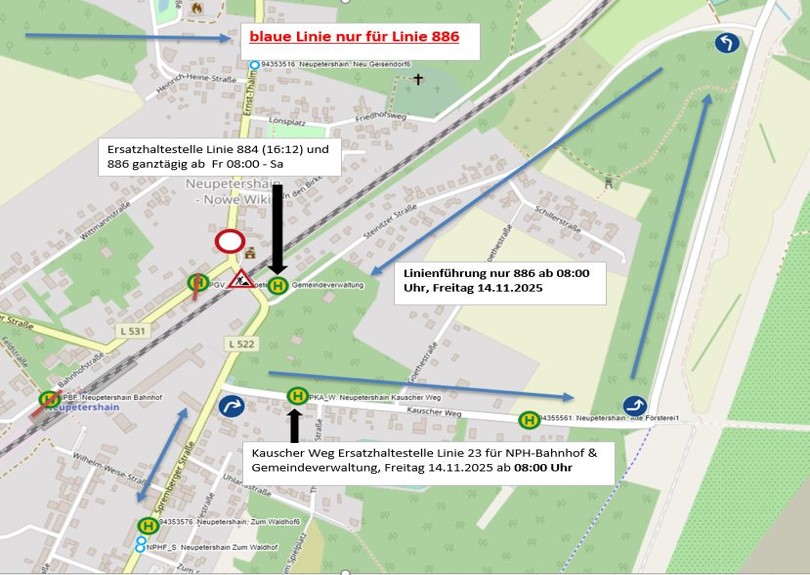Die Linie 886 verkehrt während der gesamten Bauzeit nicht über die Haltestellen „Gemeindeverwaltung“ und „Bahnhof“.  Stattdessen wird ebenfalls die Ersatzhaltestelle „Steinitzer Straße“ angefahren.