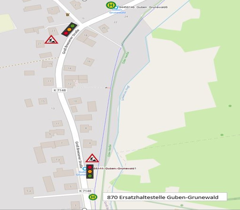 Vom 16. März 2026 bis voraussichtlich 24. Juli 2026 kommt es wegen der Erneuerung der Trinkwasserversorgung in der Groß Breesener Straße in Grunewald zu einer halbseitigen Straßensperrung mit Ampelregelung. In Richtung Groß Breesen wird die Haltestelle „Guben Grunewald“ für die Dauer der Arbeiten circa 100m in Richtung Guben verlegt.